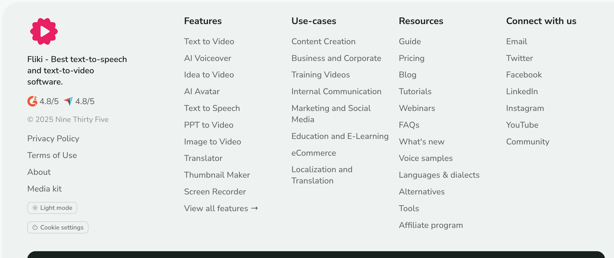 用例驱动的网站结构:Fliki 的网站组织按功能、用例和探索内容分类,这种结构不仅对 SEO 友好,也帮助不同阶段的用户快速找到所需信息。